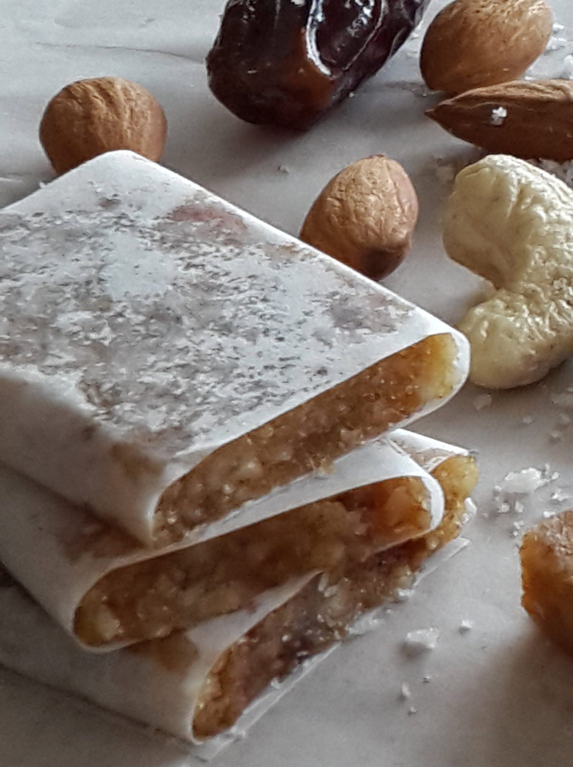Who doesn’t enjoy a piece of something sweet every now and then? With a cup of coffee or tea or after a meal? I know I do and to satisfy that occasional craving I keep bars like these around. Inspired by Larabar and Raw Bite bars, they are made with only a few all-natural ingredients like dried fruit and nuts and perhaps a spice for flavor. This is one of my favorites: with coconut and dates, almonds and cashews. Believe me: a small piece does the trick and unlike most of the so-called “health” bars you find on the shelves, they are actually healthy!