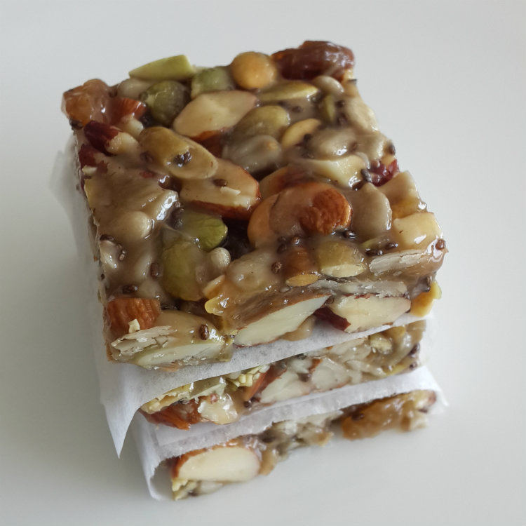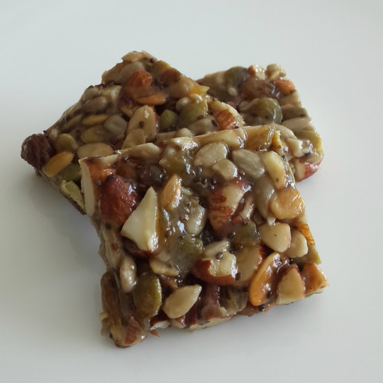 - In a bowl combine the nuts, seeds, raisins and salt