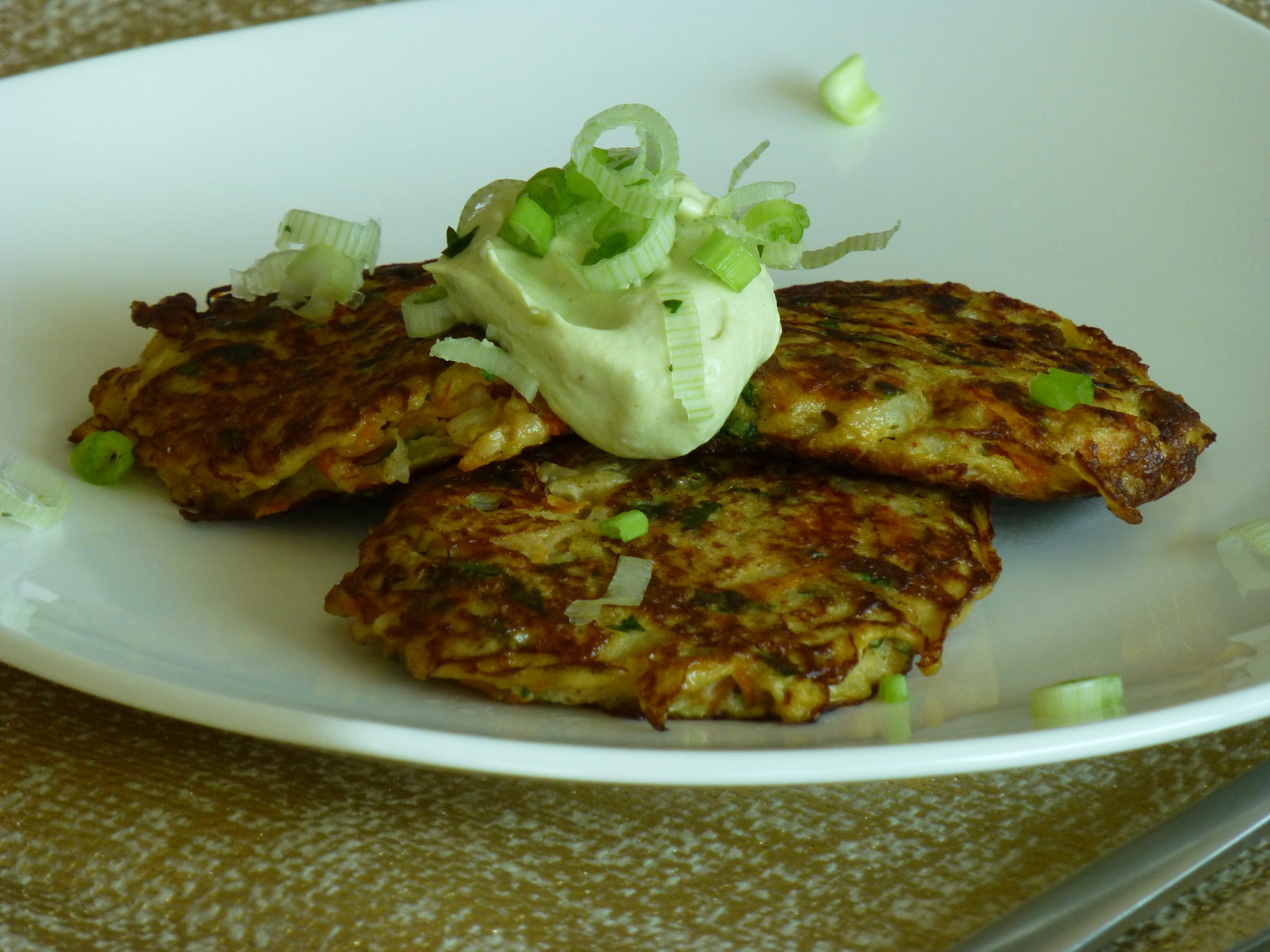 It’s a strange looking vegetable that I have passed by in the supermarket many times wondering what it actually was. Until my curiosity got the better of me and I brought some home today. A quick search on google showed it was kohlrabi, a bulbous vegetable which is a member of the brassica family (like cabbage, broccoli, kale, brussels sprouts etc). Turns out I have eaten it before, at home in Holland where it is often used in soups etc. It is very rich in vitamins, minerals, fiber and health-promoting phytochemicals. Kohlrabi can also be eaten raw (like radish) or roasted or steamed. In this recipe I grated it and used it along with carrot, coriander and some seasoning to make lovely, tasty little cakes. Topped with some avocado cashew cream and chopped spring onion they are a great as a starter or served along with your main meal. Paleo approved!