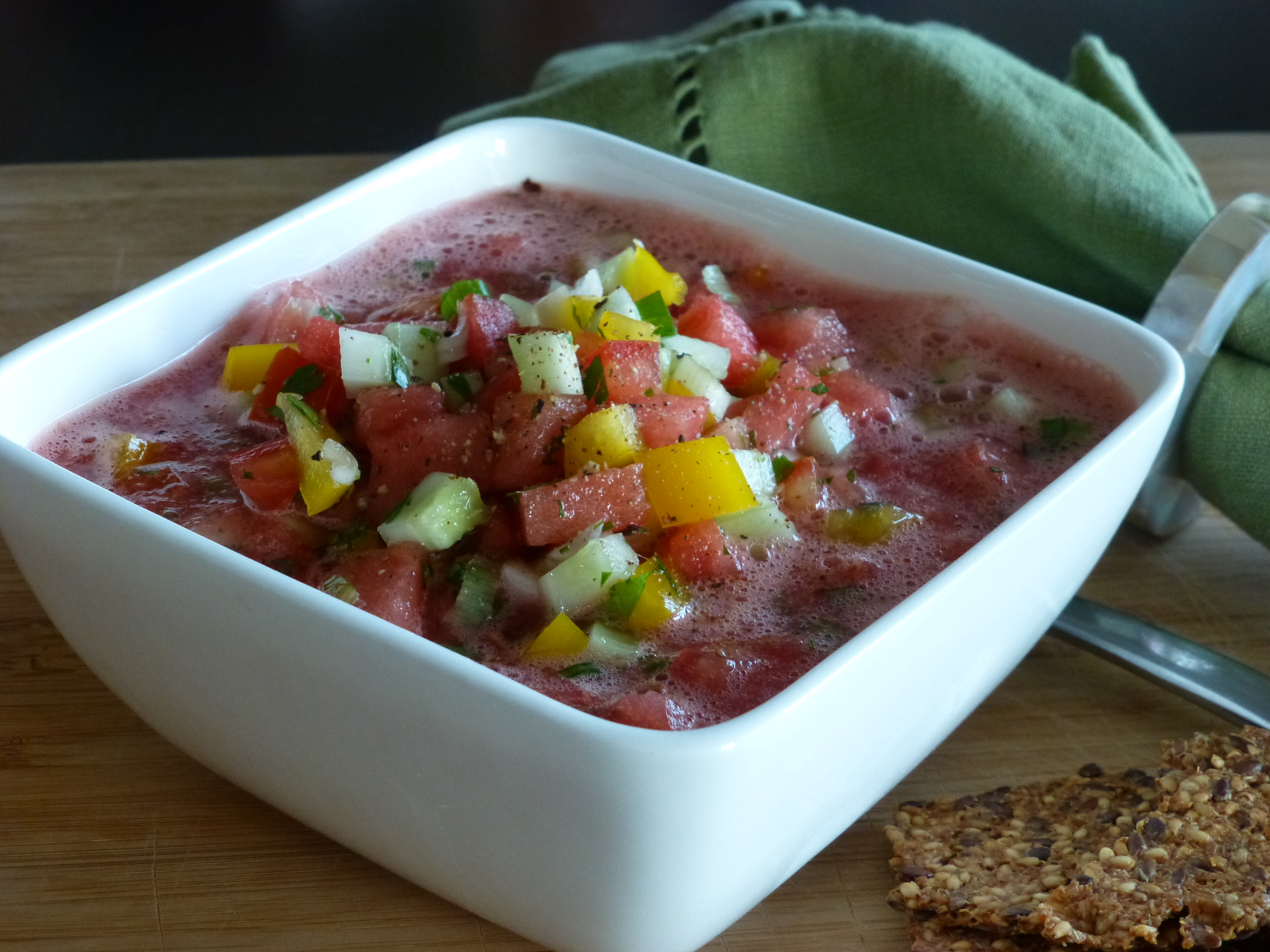 - In a large bowl combine, the watermelon puree with the diced vegetables, season, taste. Chill in fridge for at least half an hour.